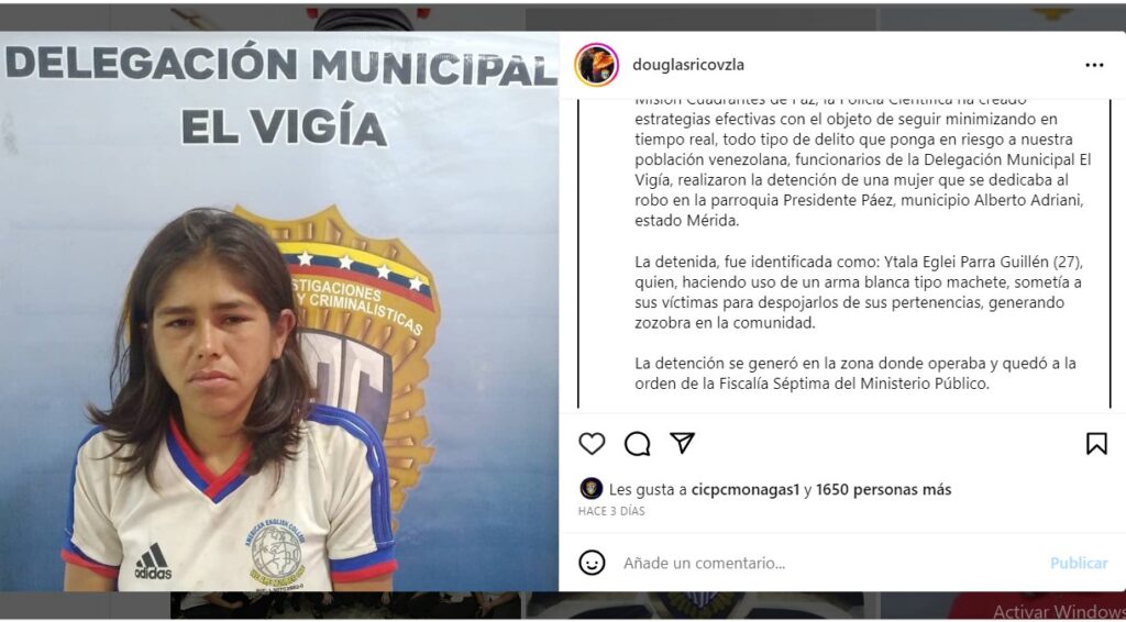 «La detenida, fue identificada como: Ytala Eglei Parra Guillén (27), quien, haciendo uso de un arma blanca tipo machete, sometía a sus víctimas para despojarlos de sus pertenencias, generando zozobra en la comunidad».