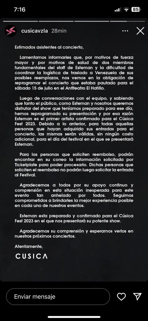 Cúsica no dio fechas de reprogramación, pero sí un anuncio y una opción: que Esteman sería el primer artista internacional confirmado para su festival 2023. Y que las entradas para su concierto en Caracas, que sería el sábado 15 de julio, son válidas para asistir el día de su presentación en el Cúsica Fest sin ningún costo adicional.