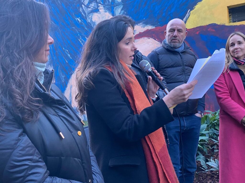 Elisa Trotta Gamus leyendo las palabras durante la inauguración del mural. Elisa Trotta Gamus