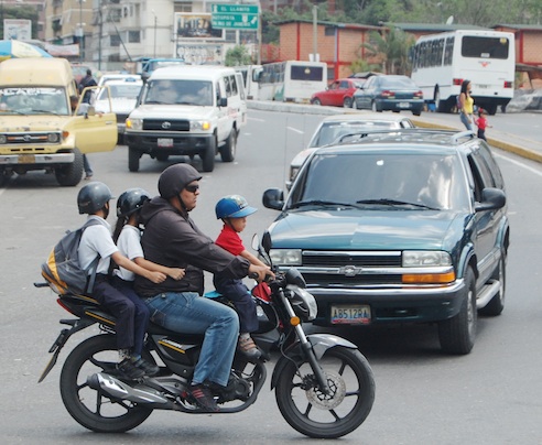 Conductor de moto en Caracas con varios niños de pasajeros. Foto cortesía.