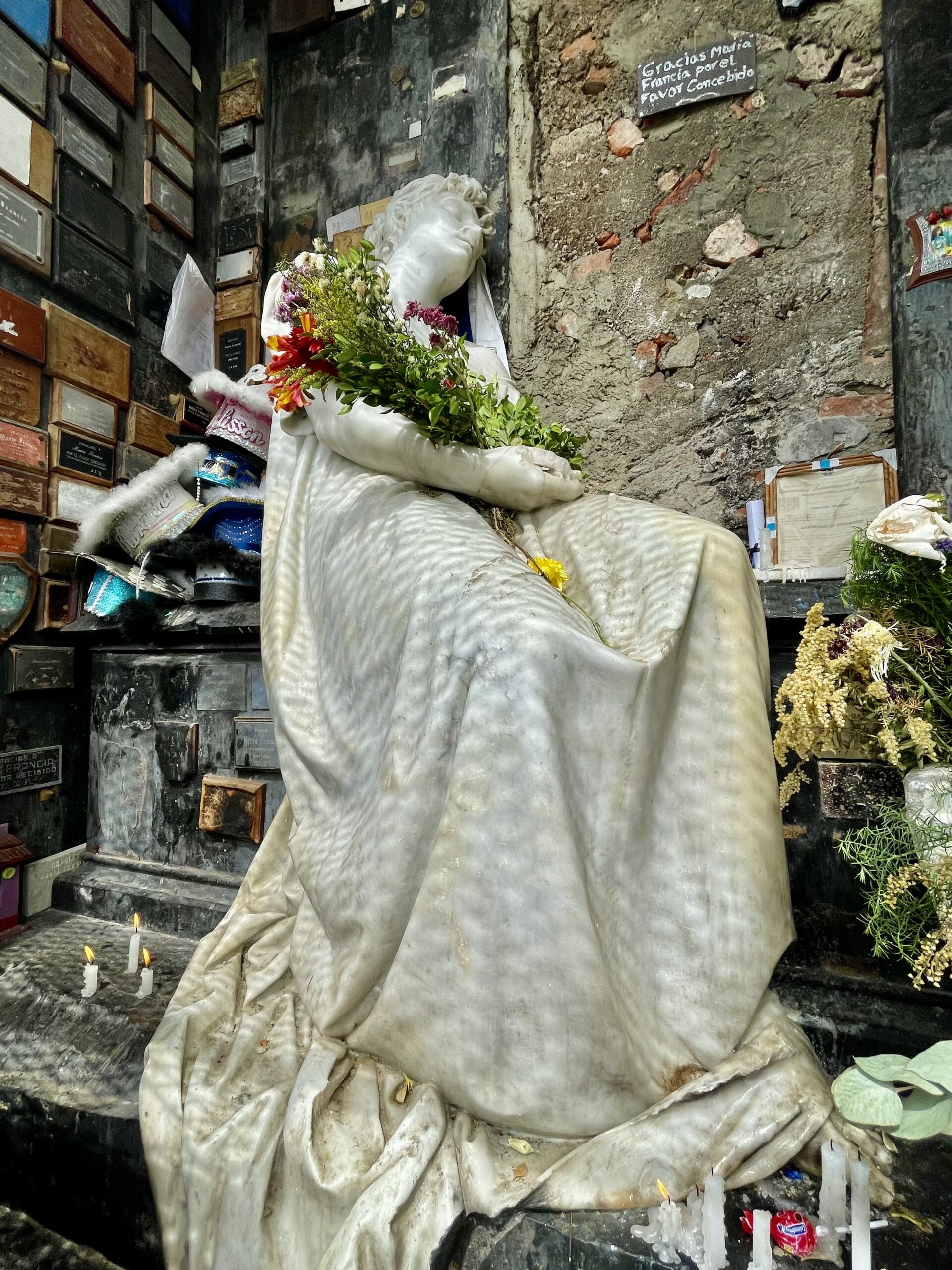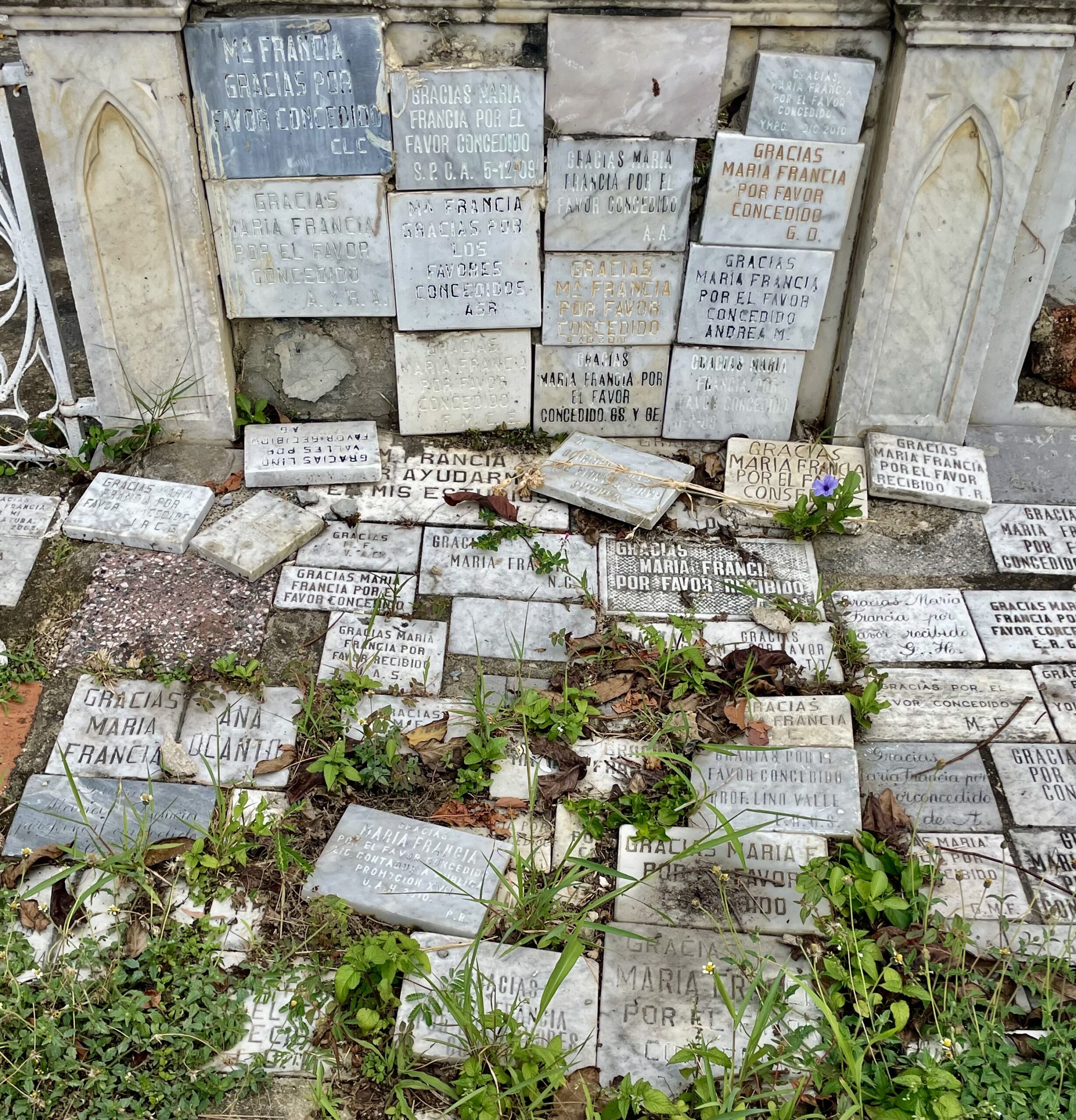 Al llegar nos estacionamos cerca del mausoleo del General Joaquín Crespo, uno de los iconos del cementerio. La cripta está totalmente saqueada, y falta uno de los cuatro ángeles que flanquean la construcción. Aún así, sigue siendo extraordinariamente bello. El trabajo de herrería es de artistas, también lo es el techo. Antes de llegar nos detuvimos en el monumento de María Francia, donde está enterrada una joven que recibió una serpiente como regalo, primorosamente envuelta en una caja, que le había enviado la amante de su novio. Dicen que murió al abrirla, aunque la leyenda que se tejió a su alrededor tiene dos versiones: la que dice que María fue picada por la culebra y la segunda: que falleció a causa del susto. El caso es que tiene muchas placas y exvotos agradeciéndole «favores recibidos», cuya mayoría -según uno de los vigilantes- es la consecución de pareja.