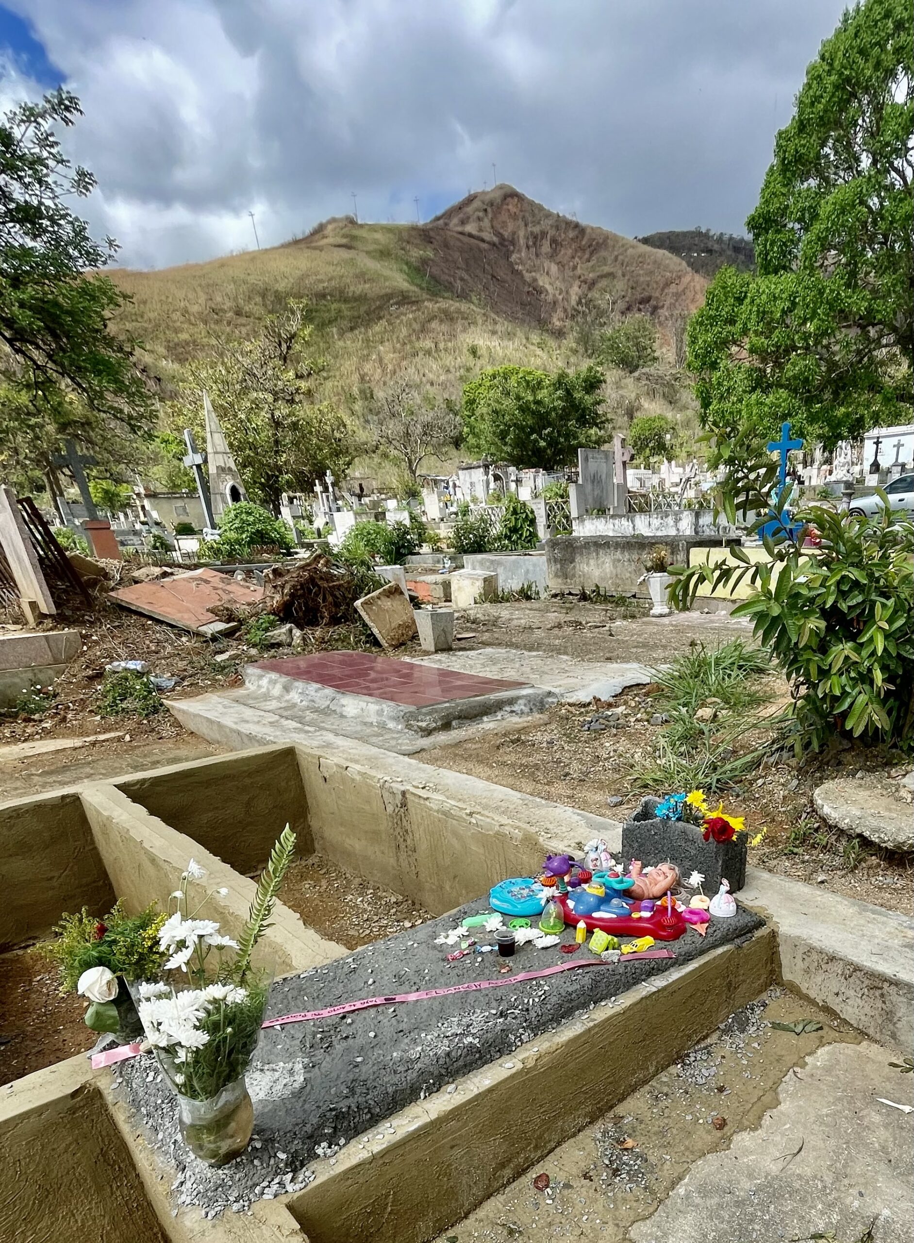 Las tumbas de niños me impresionan. Y algunas tienen encima juguetes y dibujos de personajes populares de las comiquitas o series animadas. Otras tumbas, pienso que las más viejas o abandonadas, fueron ocupadas para enterrar a otros muertos. Muchas están selladas con bloques de arcilla o de cemento, lo que definitivamente contribuye a afear el ambiente.
