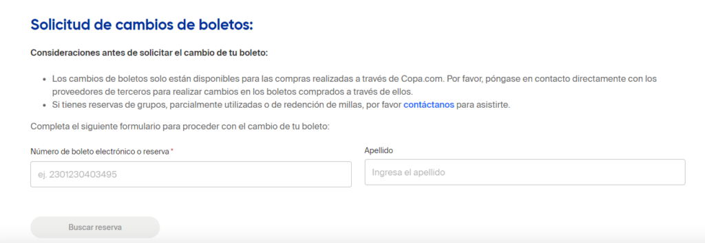 Los cambios de boletos solo están disponibles para las compras realizadas a través de Copa.com. Si el boleto aéreo fue comprado en una agencia de viajes, es necesario contactar a la agencia para solicitar el reembolso.