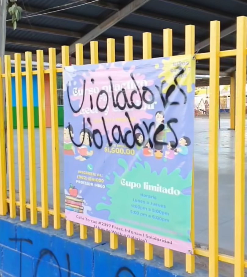 Antes de la protesta que llamaron los familiares de los niños del preescolar, la fachada de la institución ya tenía varios graffitis. «Violadores» se puede leer en las rejas, afiches y paredes.