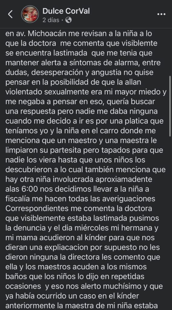 «La directora comentó que ella y los maestros acuden a los mismos baños que los niños. Lo dijo en repetidas ocasiones. Eso nos alertó muchísimo (…) ya había ocurrido un caso en el kínder anteriormente», explicó Dulce en un post de Facebook.