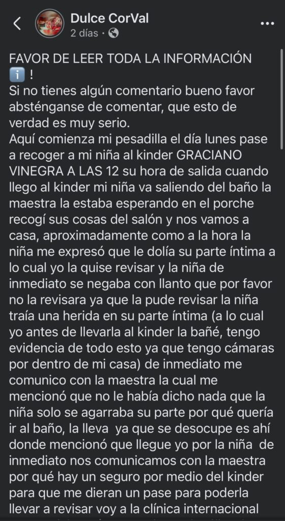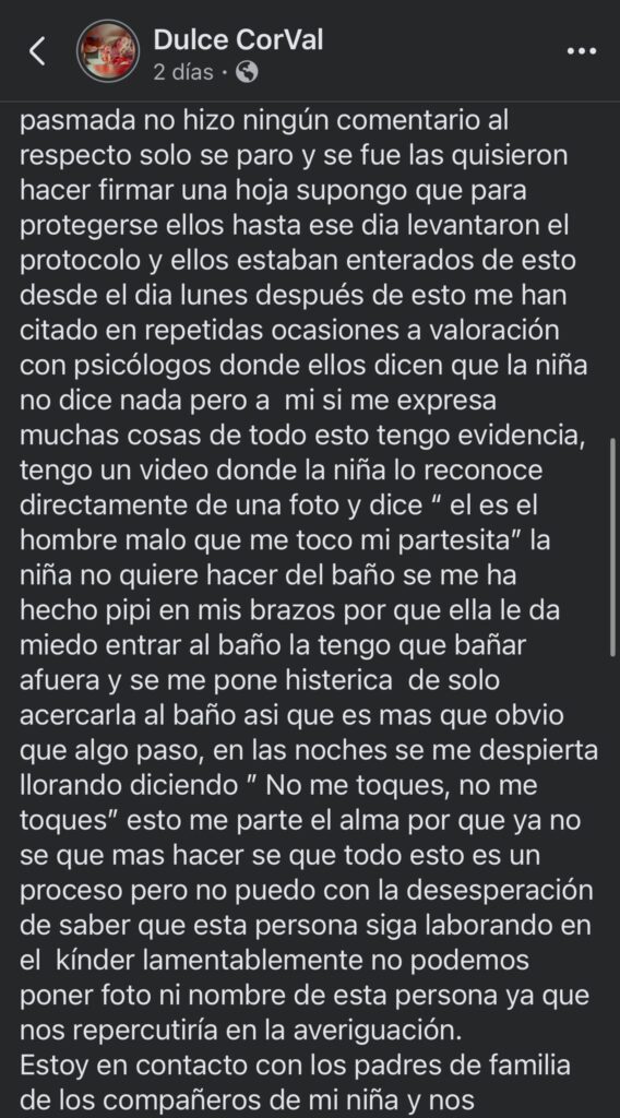 «Esto me parte el alma porque ya no sé qué más hacer. Sé que todo esto es un proceso, pero no puedo con la desesperación de saber que esta persona siga laborando en el kínder», relata Dulce en Facebook.