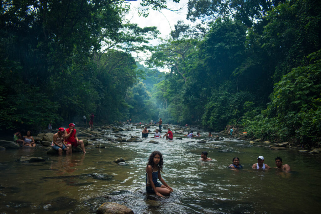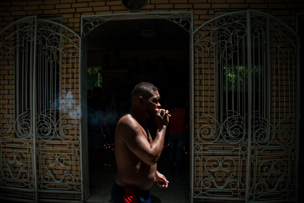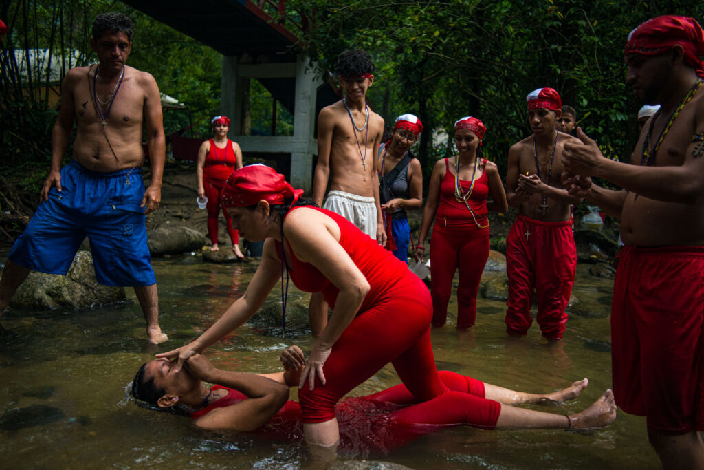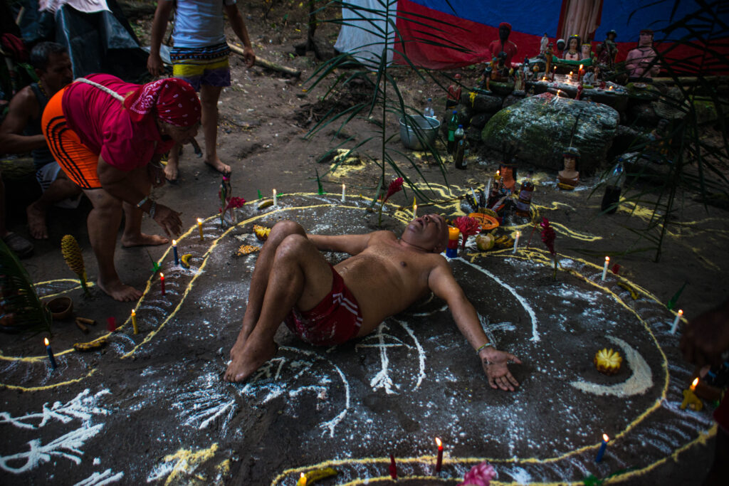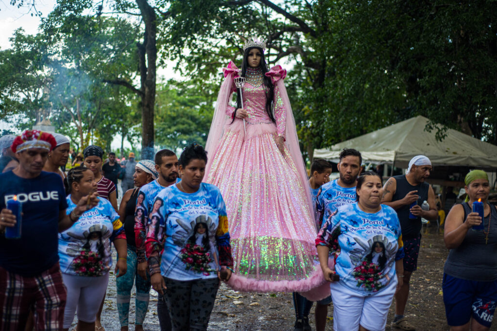 Un hombre fuma un tabaco mientras camina frente al altar mayor en la montaña de Sorte en las afueras de Chivacoa, en el estado de Yaracuy, Venezuela, el 11 de octubre de 2022. (Maxwell Briceño)Un hombre yace rodeado de devotos en un río durante una ceremonia de limpieza espiritual en el río, realizada por un medium durante la fiesta religiosa anual de María Lionza en las montañas de Sorte en Yaracuy el 11 de octubre de 2022. (Maxwell Briceño)Devotos sostienen una figura de María lionza vestida de reina durante la fiesta religiosa anual en las montañas de Sorte en Yaracuy el 11 de octubre de 2022 (Maxwell Briceño)