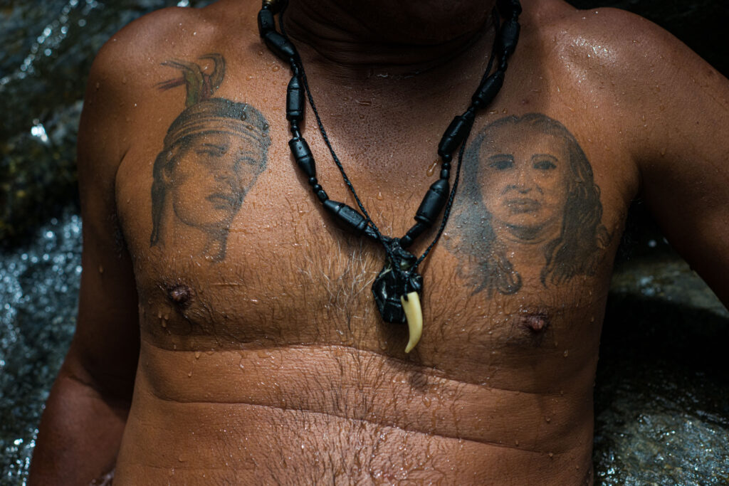 Un hombre lleva tatuado en su pecho de izquierda a derecha la imagen del cacique Guaicaipuro y de su fallecida madre, durante la fiesta religiosa anual de María Lionza en las montañas de Sorte en Yaracuy el 11 de octubre de 2022. (Maxwell Briceño)Un médium participa en un ritual de transportación espiritual en la montaña de Sorte en las afueras de Chivacoa, en el estado de Yaracuy, Venezuela, el 11 de octubre de 2022 (Maxwell Briceño)Un médium participa en un ritual de transportación espiritual en la montaña de Sorte en las afueras de Chivacoa, en el estado de Yaracuy, Venezuela, el 11 de octubre de 2022 (Maxwell Briceño)Un grupo de personas tocan tambor durante un ritual espiritual en la montaña de Sorte en las afueras de Chivacoa, en el estado de Yaracuy, Venezuela, el 11 de octubre de 2022. El tambor es parte del llamado a la energía y vínculo entre lo ancestral y lo terrenal (Maxwell Briceño)