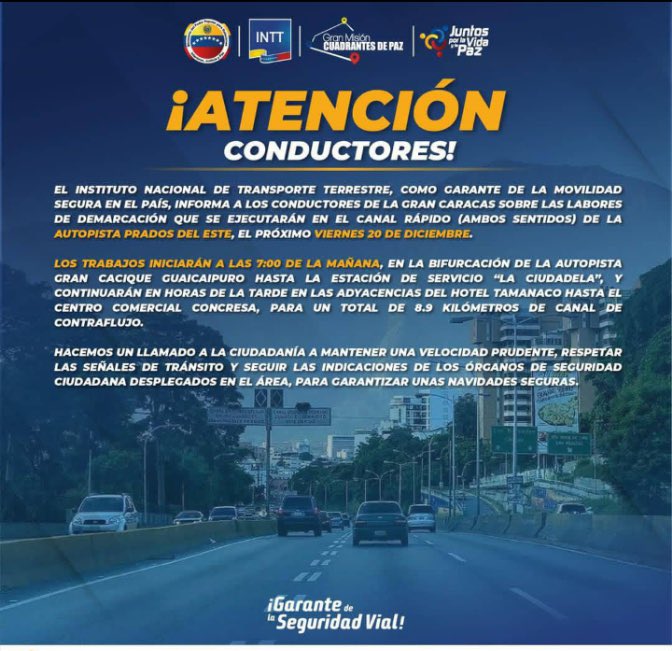 El INTT indicó que solo estarán cerrados los canales rápidos de la Autopista Prados del Este el viernes #20Dic. Instó a los conductores a tomar sus previsiones