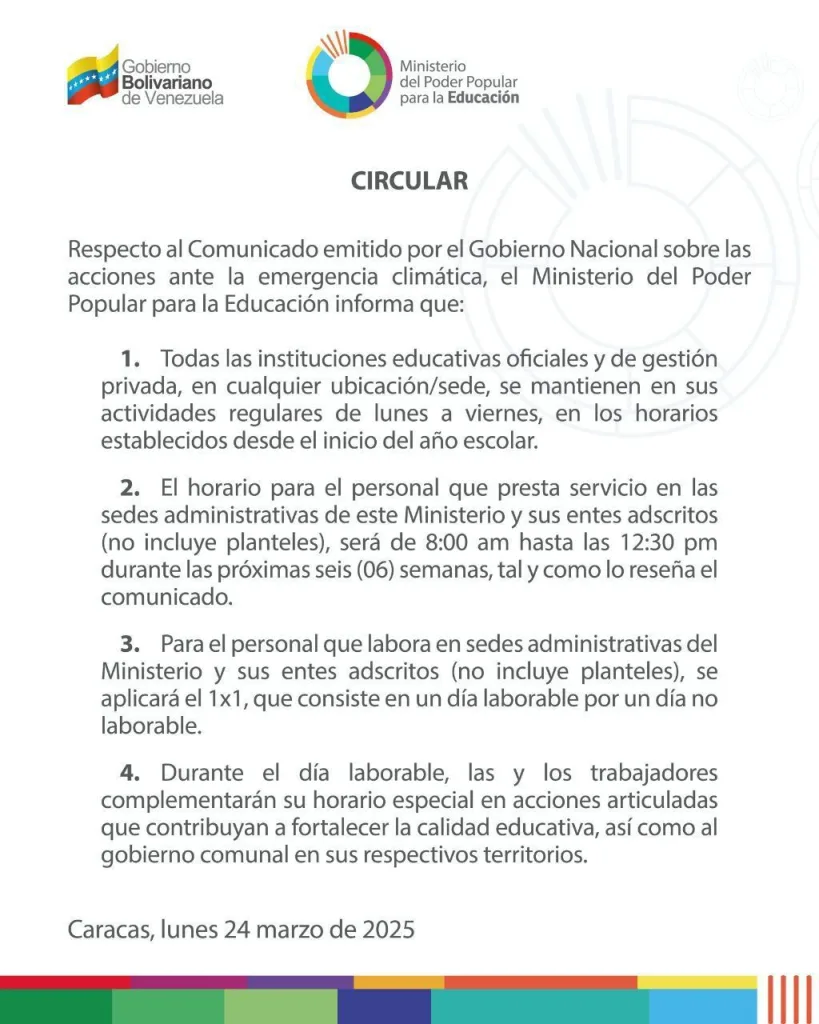 En un comunicado, compartido a través del canal de Telegram del ministro Héctor Rodríguez, se indica que la restricción de horarios, por la «emergencia climática» que anunció Corpoelec, solo aplicará a sedes administrativas del ministerio y otros entes adscritos.