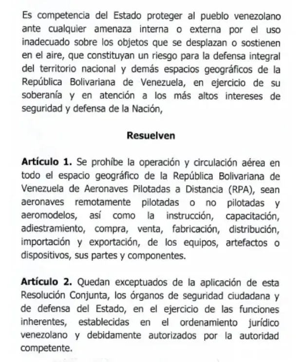 El gobierno de Venezuela prohibió por 30 días el vuelo de drones en Venezuela. A través de la Gaceta Oficial número 6.927, de fecha 18 de agosto de 2025, se ordenó la decisión con el fin de «proteger al pueblo venezolano ante cualquier amenaza interna o externa por el uso inadecuado sobre los objetos que se desplazan o sostienen en el aire».