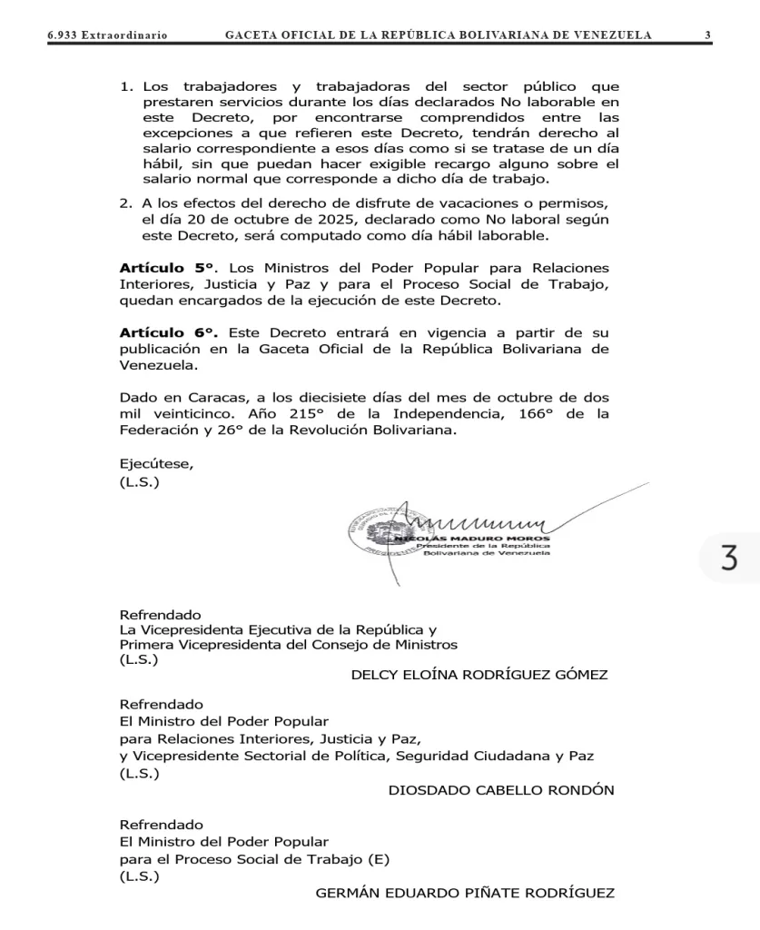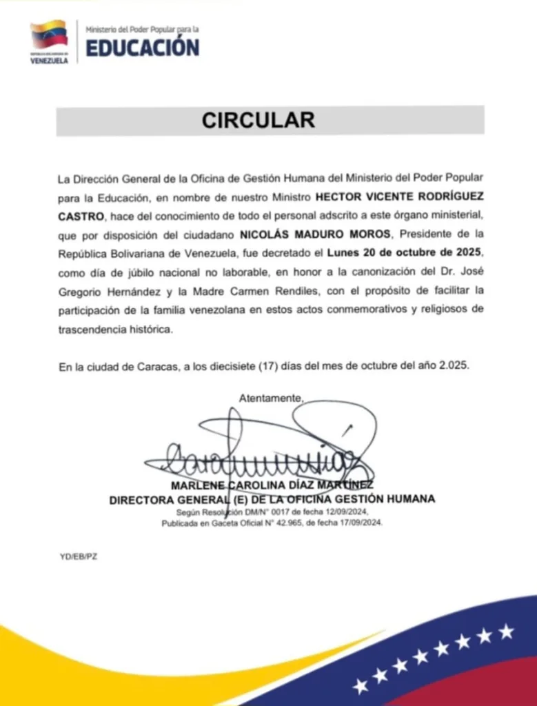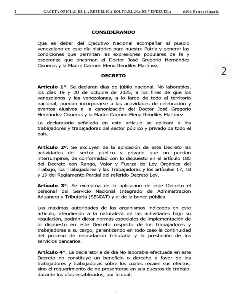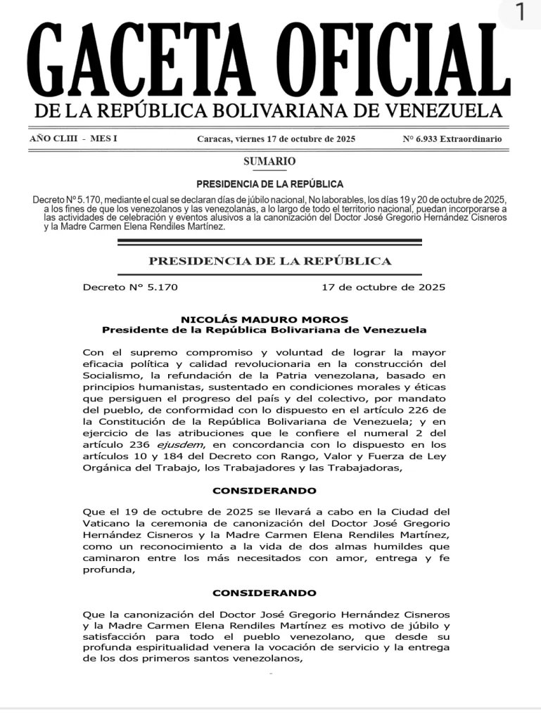 El gobierno venezolano decretó no laborable los días 19 y 20 de octubre por la canonización de José Gregorio Hernández y Carmen Rendiles. A través de la Gaceta Oficial 6.933, con fecha del 17 de octubre, se indica que la decisión se tomó para que los venezolanos puedan incorporarse a las distintas actividades por este evento.