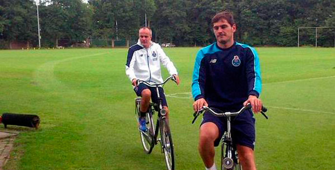 Iker Casillas, guardameta español del Oporto, realizó hoy su primer entrenamiento con los dragones en la localidad holandesa de Horst, donde se encuentran concentrados.El ya exportero del Real Madrid fue el primero en recorrer en bicicleta el trayecto que separa el hotel del campo de entrenamiento, momento que capturaron las cámaras de todos los medios en imágenes que el propio club luso difundió en sus páginas oficiales de las redes sociales con el texto de «Primer entrenamiento».