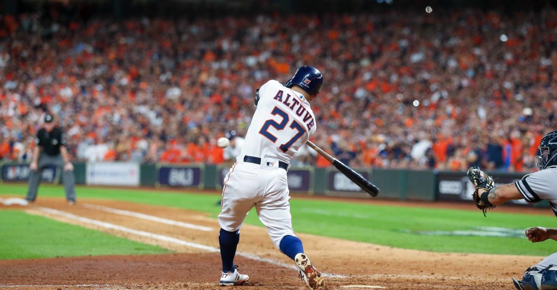 Altuve castigó al veloz cubano Aroldis Chapman con dos outs y envió la pelota por encima de las vallas del jardín izquierdo del Minute Maid Park de Houston para dar a los Astros la serie por 4-2 y la corona de la Liga Americana.
