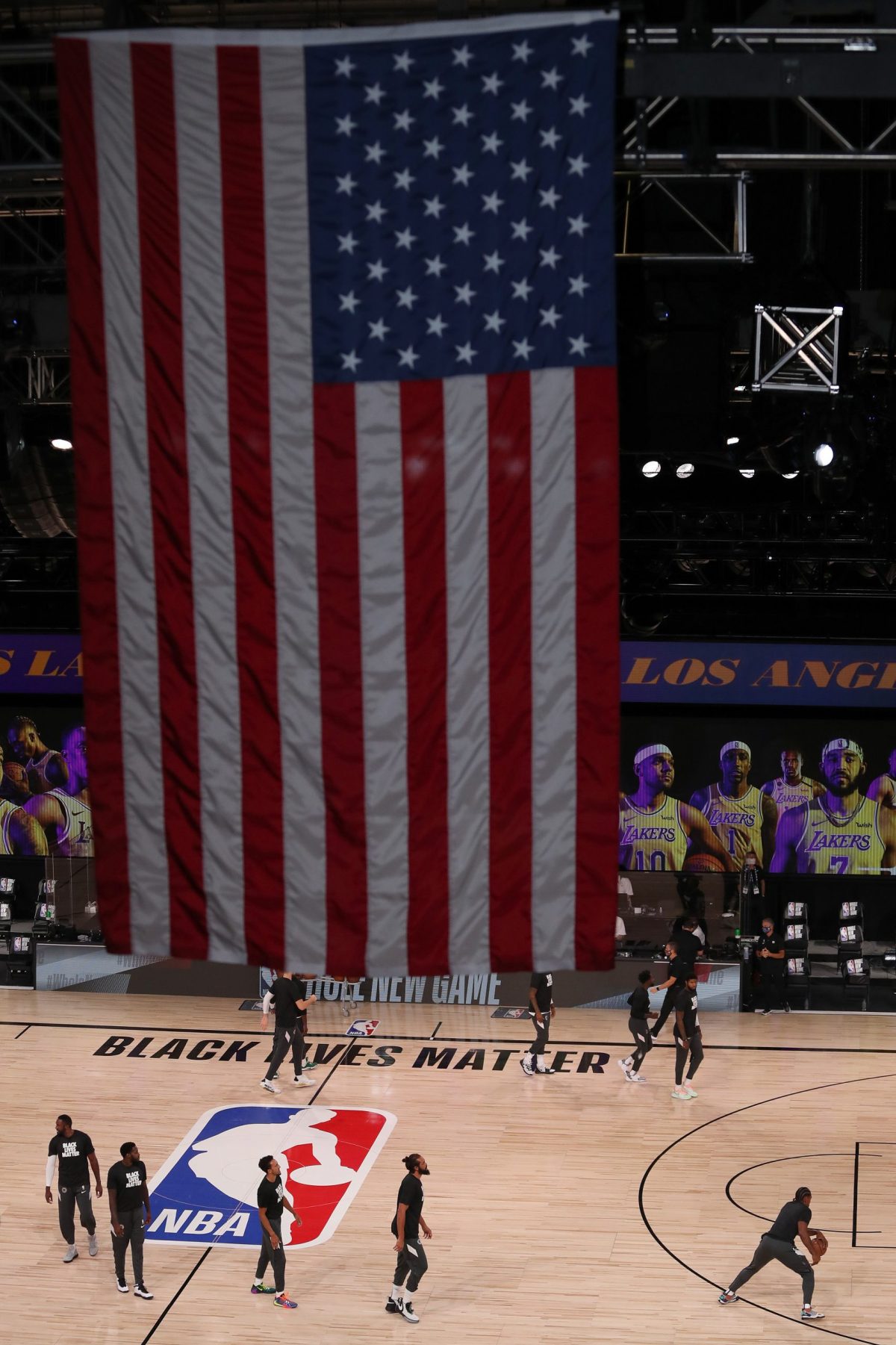 En un gesto insólito en la NBA, y prohibido en sus reglamentos, estrellas como LeBron James (Los Angeles Lakers) y Kahwi Leonard (Los Angeles Clippers) junto a todos sus compañeros formaron una sola fila e hincaron al unísono una rodilla en la pista cuando empezó a sonar el himno previo a los juegos.