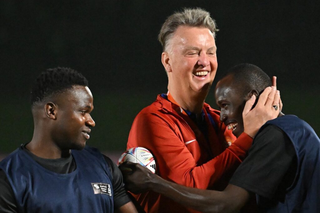El DT de Países Bajos, Louis van Gaal, abraza a a un jugador durante una sesión de entrenamiento en la Universidad de Catar, este 17 de noviembre, a pocas horas de que empiece el Mundial. Foto: Alberto PIZZOLI / AFP