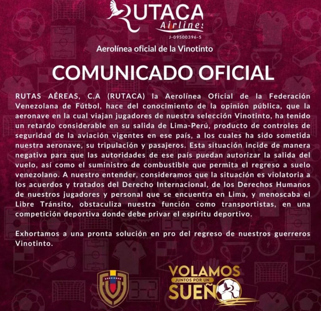 🚨#LAPInforma🚨 Sobre el retraso registrado por la aeronave de la @SeleVinotinto, en el aeropuerto #JorgeChávez, informamos, a la comunidad, que esto ocurrió por motivos netamente administrativos relacionados al abastecimiento de combustible. 1/2 pic.twitter.com/feMJf8ttkr