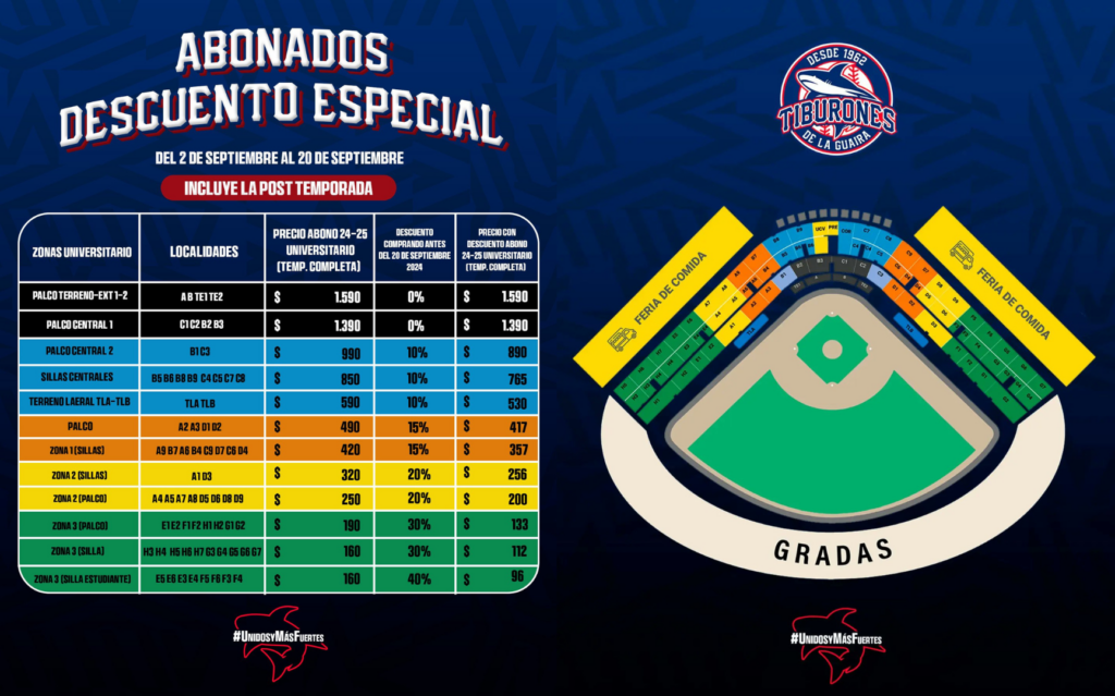 Esta es la lista completa de precios de los para disfrutar toda la temporada -incluida la postemporada- de los Tiburones de La Guaira en condición de home club: