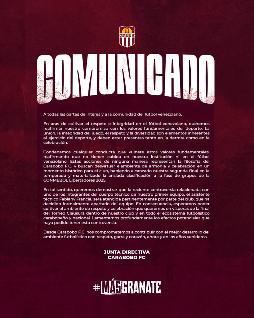 Ante esta situación, la dirigencia de Carabobo FC emitió un comunicado para aclarar que “la controversia con el asistente técnico Fabiany Francia será atendida pertinentemente por parte del club, que ha decidido formalmente apartarlo del equipo”.
