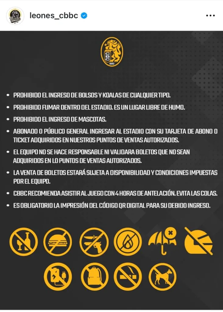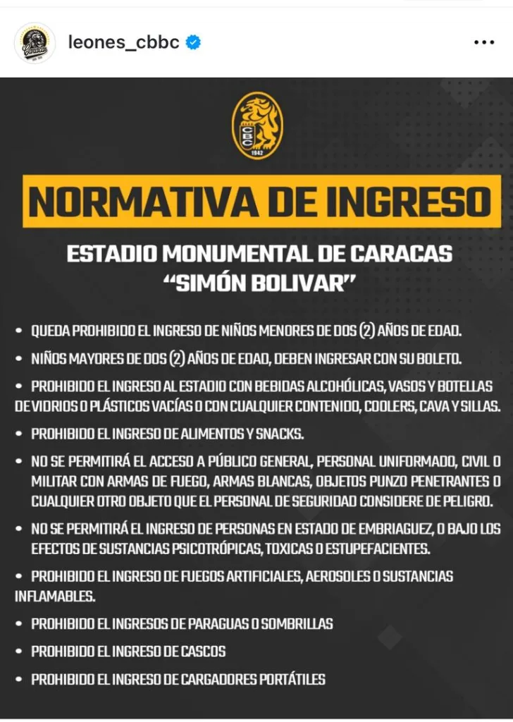 Los Leones del Caracas publicaron en sus redes sociales las condiciones de acceso al Estadio Monumental, ubicado en La Rinconada y sede de este equipo de béisbol, y se hicieron virales por las reacciones que causaron entre sus propios fanáticos. Entre ellas está la prohibición de entrar con cualquier tipo de bolsos, ni siquiera koalas o riñoneras, y la «sugerencia» de llegar 4 horas antes de cada juego para «evitar colas».