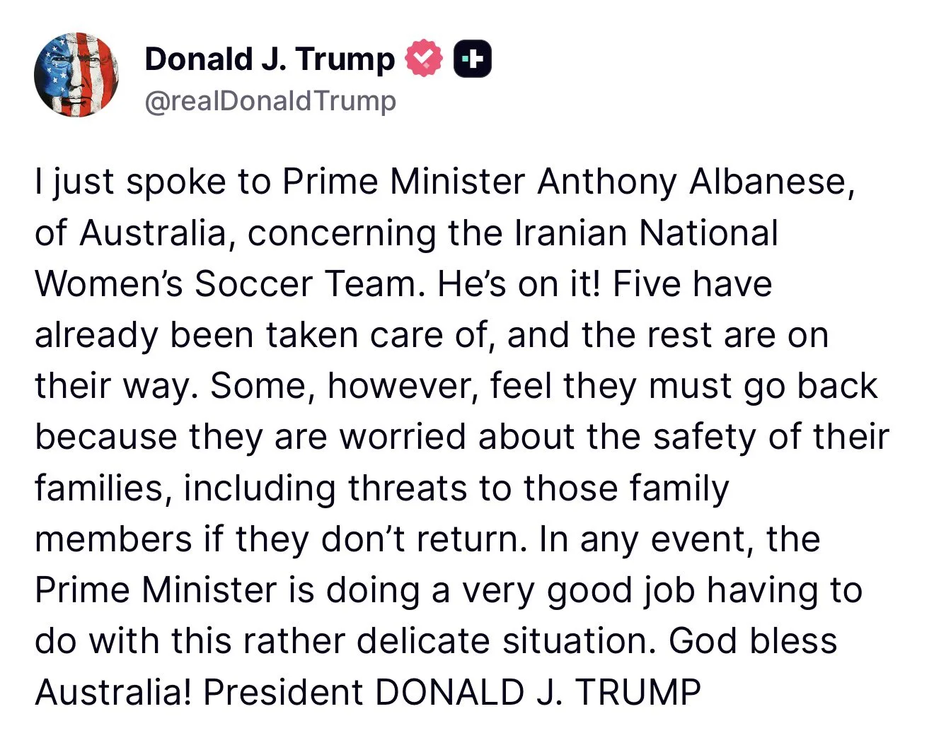 Según Anthony Albanese, primer ministro de Australia, están buscando la manera de ofrecer protección al resto del equipo. Trump felicitó su decisión y afirmó que muchas igual tendrán que volver a Irán por temor a represalias contra sus seres queridos.