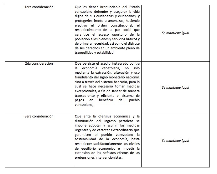 El decreto se explica por «las circunstancias extraordinarias en el ámbito social, económico y político, que afectan el orden constitucional, la paz social, la seguridad de la Nación, las instituciones públicas» y los habitantes de Venezuela, dice la introducción del texto.