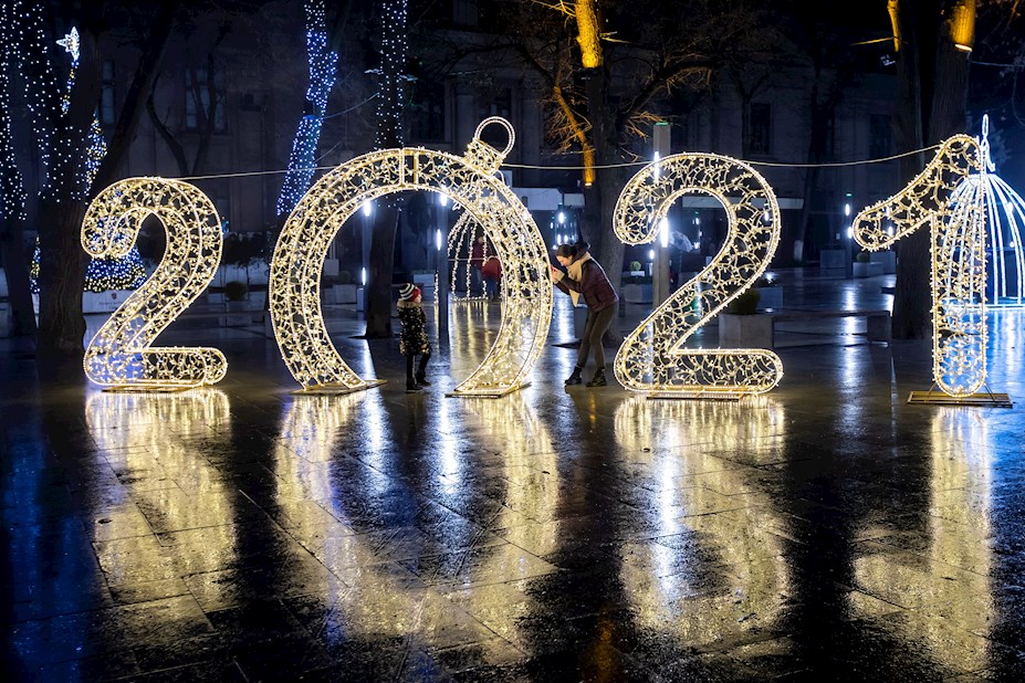 Una madre le toma fotos a su hijo en el cartel de 2021 en el centro de Chisinau, Moldavia, el 24 de diciembre de 2020. Tradicionalmente, las personas de los antiguos países de la Unión Soviética aún celebran la Navidad en dos ocasiones, el 25 de diciembre y el 7 de enero. EFE/ Dumitru Doru.