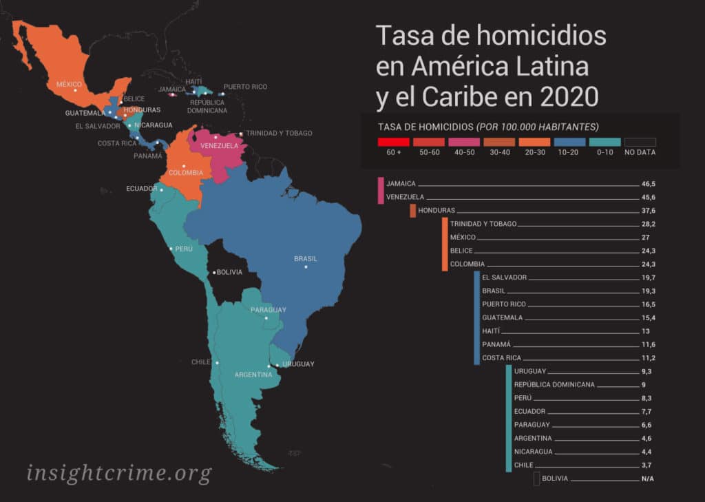 «Jamaica fue el país más violento de América Latina y el Caribe el año pasado (con una tasa de homicidio de 46,5 por cada 100.000 habitantes), seguido de Venezuela (45,6) y Honduras (37,6)», señala el informe de Amnistía, que en este apartado cita datos de InSight Crime.