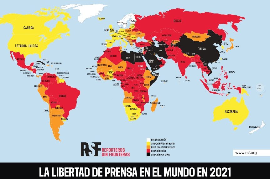 El ejercicio del periodismo está como mínimo parcialmente bloqueado en más de 130 países, según la clasificación mundial sobre libertad de prensa en 2021 divulgada por la ONG Reporteros Sin Fronteras (RSF).