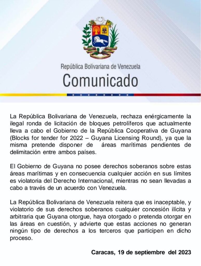 #Comunicado Venezuela rechaza enérgicamente la ilegal ronda de licitación de bloques petrolíferos que actualmente lleva a cabo el Gobierno de la República Cooperativa de Guyana en áreas marítimas pendientes de delimitación entre ambos países. pic.twitter.com/8mcjivUpdi