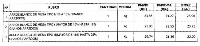 De acuerdo a los decretos 078 y 079 de la Superintendencia Nacional para la Defensa de los Derechos Socioeconómicos (Sundde), publicados el pasado martes 10 de noviembre de 2015, se ratifican los precios del arroz blanco y la harina de maíz precocida, respectivamente.