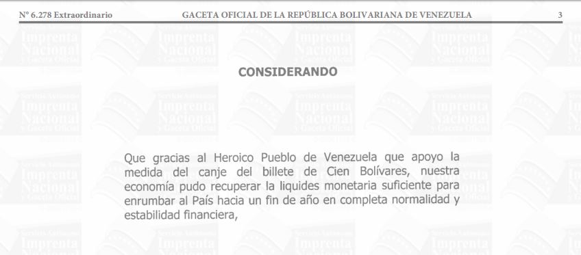 En el decreto 2.610, el Ejecutivo asegura que el gobierno aplicó una «extraordinaria operación» en contra de «las mafias del billete», a pesar de no mostrar pruebas al respecto. Lo que sí se evidenció fue que la falta de efectivo generó disturbios en poblaciones como El Callao y Guasdualito. Asegura además que los aviones que contenían los nuevos billetes fueron «desviados descaradamente» pero que «el heroico pueblo» demostró tener la valentía para asegurar «un fin de año en completa normalidad».
