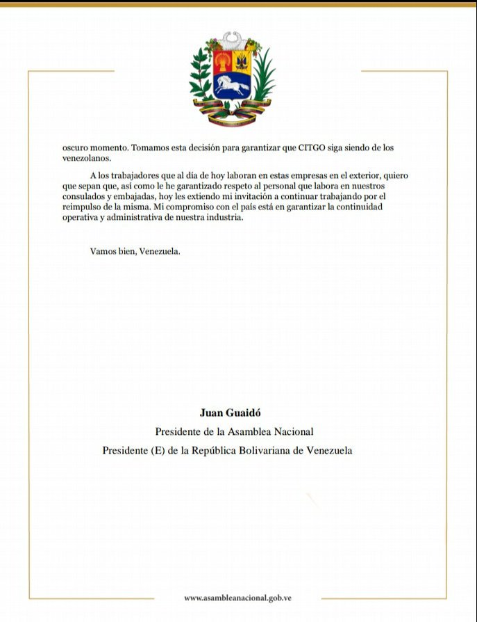 En su nota, Guaidó, presidente del Parlamento de mayoría opositora, aseguró que iniciará el proceso de nombramiento de las juntas directivas de PDVSA y Citgo, para «iniciar la recuperación de nuestra industria que hoy pasa por un oscuro momento».