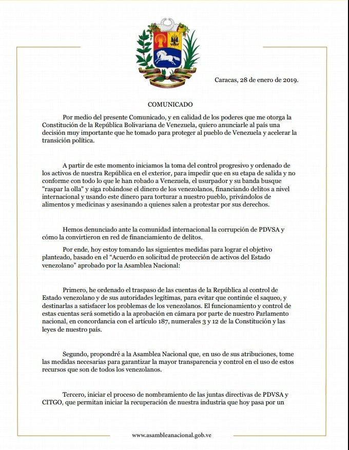 «A partir de este momento iniciamos la toma del control progresivo y ordenado de los activos de nuestra República en el exterior, para impedir que en su etapa de salida (…) el usurpador y su banda busque ‘raspar la olla’ (agotar)», dijo en un comunicado difundido en redes sociales.