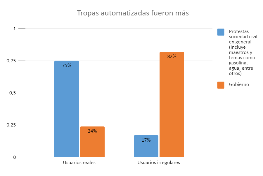 Los docentes y trabajadores públicos por su parte posicionaron 6 tendencias en el mismo período tiempo, todas con exigencias económicas y acompañando las protestas de calle. Estas acumularon aproximadamente 200 mil 431 mensajes. En promedio al menos el 90,85% de los mensajes oficialistas del 1 al 24 de enero fueron manipulados mientras que el 70,35% de los tuits de la protesta ciudadana fueron realizados por usuarios reales.