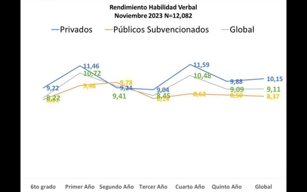 Igual que sucede con matemáticas, persiste la brecha de aprendizaje entre alumnos de planteles privados y públicos, aunque en habilidad verbal los de instituciones privadas se mantuvieron ligeramente sobre la línea aprobatoria, con una nota promedio de 10,15 puntos sobre 20, mientras los del sector público subvencionado registraron calificaciones promedio de 8,37/20. Es decir, una diferencia de más de 1 punto.