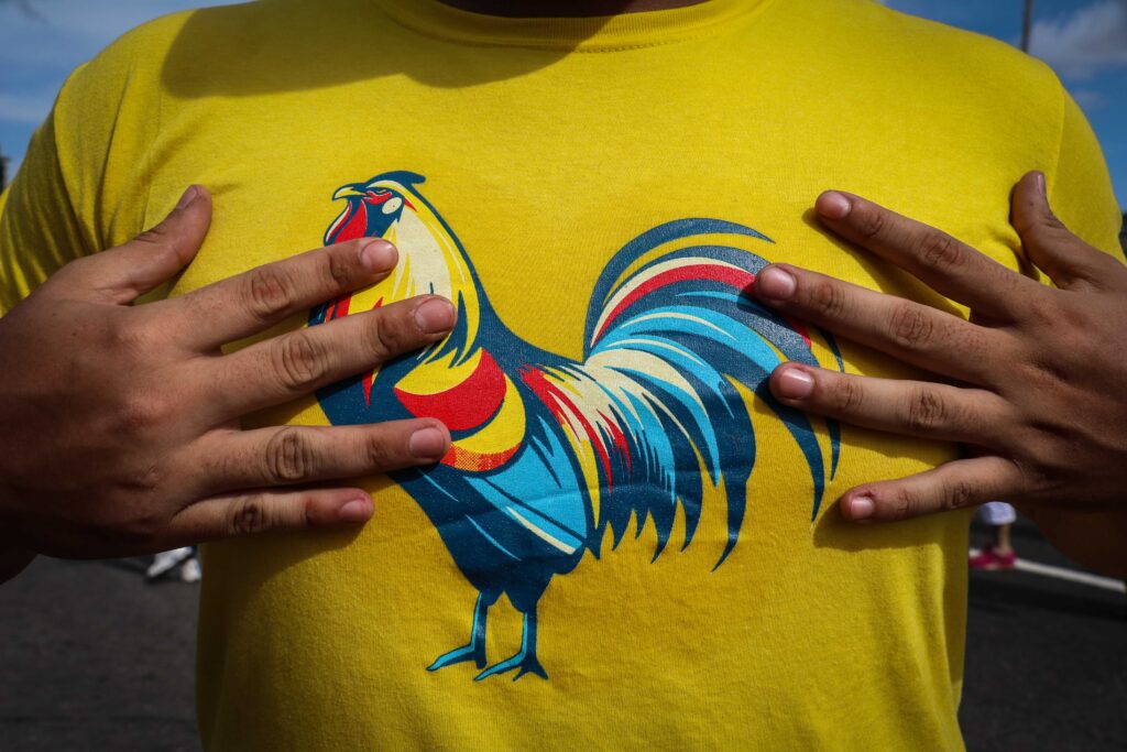 En Plaza Venezuela, a las tres de la tarde se veían muchas personas esperando cerca de la icónica fuente. Todos con la camisa del famoso“Gallo Pinto” o “Gallo Nico”, en alusión a la canción de la campaña del presidente.