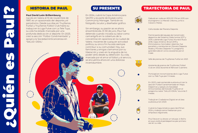 Hace apenas cuatro meses Paul había empezado a trabajar como camarógrafo junto a VPItv. Llegó a este trabajo cuando uno de sus colegas decidió irse del país y lo recomendó. Lo vio como un trabajo alterno a su pasión de comentarista deportivo. Jamás pensó que sostener una cámara lo llevaría a ser detenido poco tiempo después.