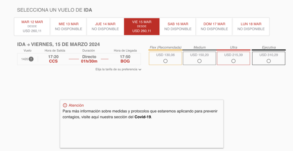 Sin embargo, Avior Airlines tiene varias categorías: la Flex va desde 130,06 dólares; Medium en $150,20; Ultra cuesta $215,39 y Ejecutiva desde $310,29.