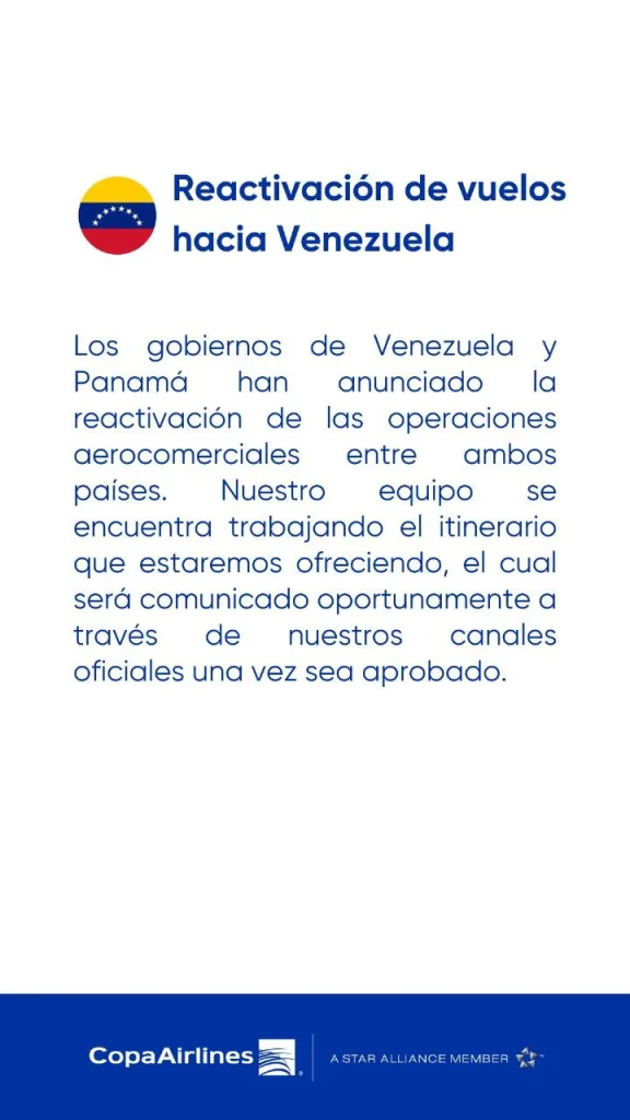 «Los gobiernos de Venezuela y Panamá han anunciado la reactivación de las operaciones aerocomerciales entre ambos países», indicó Copa Airlines en su comunicado.