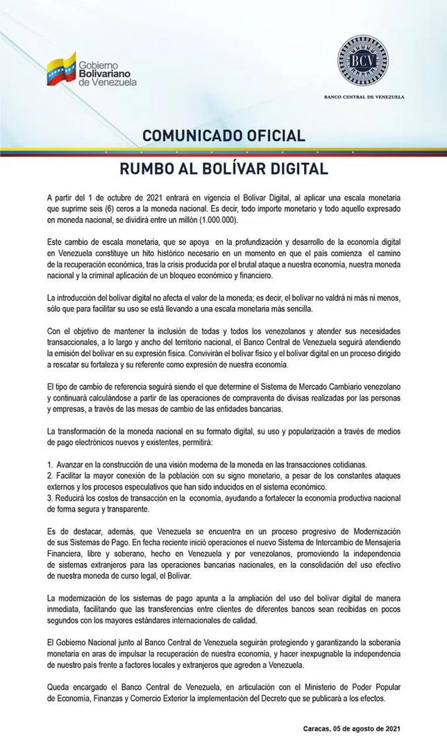 El comunicado del Banco Central tiene el tono triunfalista que el chavismo otorga a lo que en realidad son derrotas porque la reconversión es una derrota económica siempre. Lo titula «Rumbo al bolívar digital». Eso, además, evidencia otro gravísimo problema en Venezuela: la falta de efectivo.