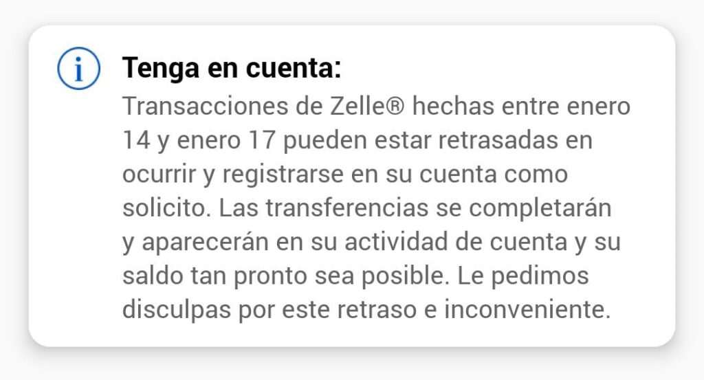 «Las transacciones hechas entre el 14 y 17 de enero pueden retrasarse y registrarse en su cuenta como solicitó. Las transferencias se completarán y aparecerán en su actividad de cuenta y su saldo tan pronto como sea posible. Le pedimos disculpas por este retraso e inconveniente», se lee.