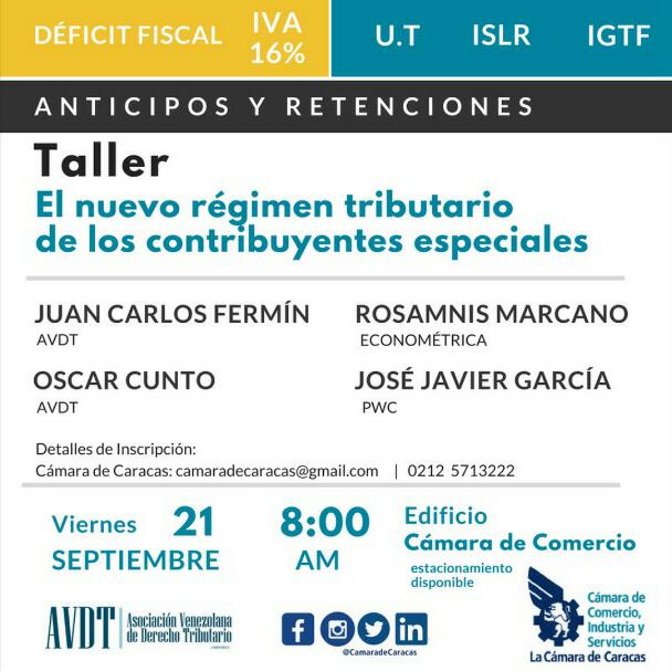 Para el 21 de septiembre, también a las 8:00 AM, se tiene previsto llevar a cabo el taller denominado Nuevo Régimen Tributario de los Contribuyentes Especiales, con la participación de los especialistas Juan Carlos Fermín, Rosamnis Marcano, César Cunto y José Javier García. Tendrá un costo general de BsS 300 + IVA.