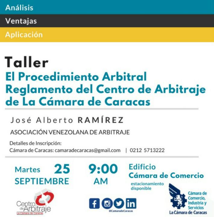 Entretanto, el 25 de septiembre se llevará a cabo el taller «El Procedimiento Arbitral | Reglamento del Centro de Arbitraje de La Cámara de Caracas, con la participación de: José Alberto Ramírez de la Asociación Venezolana de Arbitraje. Los interesados deberán cancelar BsS. 150 + IVA General y los estudiantes BsS. 100 + IVA. Estos últimos deben presentar una credencial.
