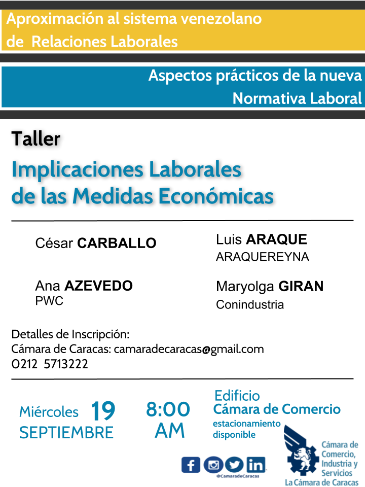 El primero de ellos tiene como título «Implicaciones Laborales de las Medidas Económicas», el cual se impartirá el 19 de septiembre a las 8:00 AM con la participación de los ponentes César Carballo, Ana Azevedo, Maryolga Girán y Luis Araque.