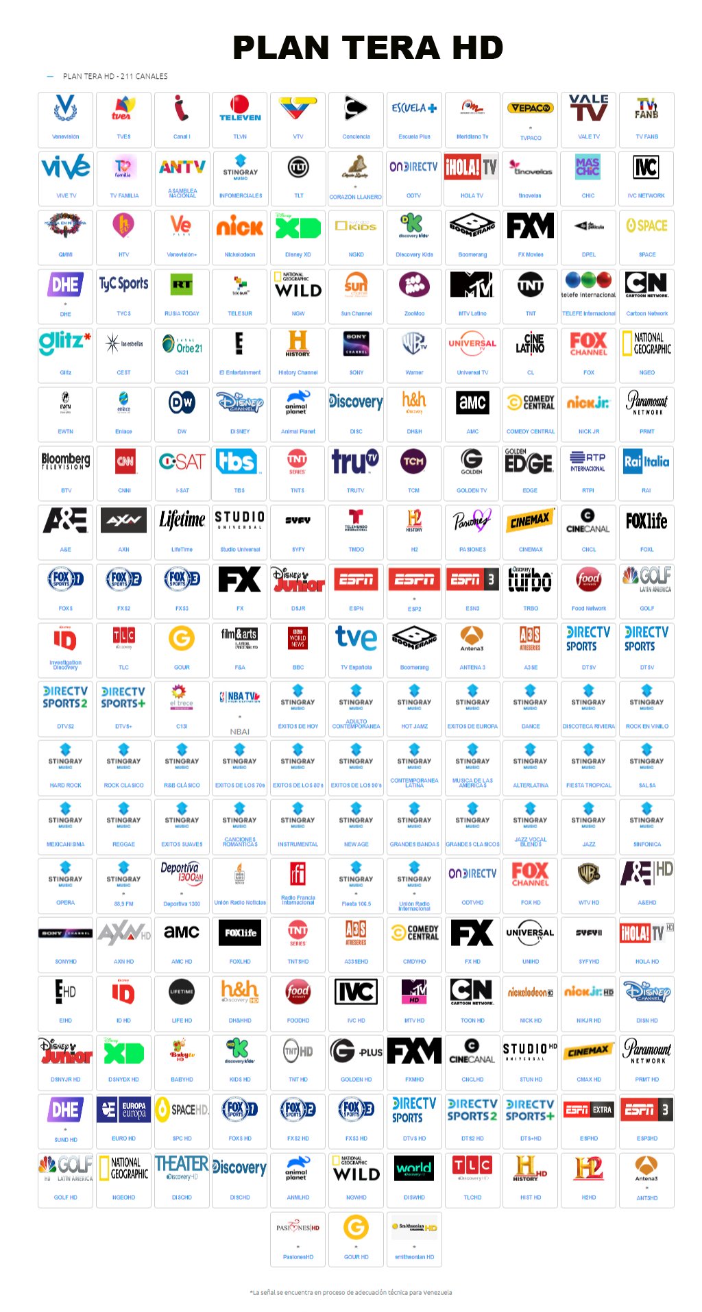 Como era de esperar, el plan más económico, que ronda cerca del dólar mensual, no cuenta con canales como Warner, Sony, AXN, Telemundo y mucho más que suelen ser los preferidos de la audiencia venezolana. Sin embargo, la gran diferencia de precios entre el plan Básico ($1) y el plan Tera HD ($28) justifica esta selección de los planes por parte de la nueva empresa que viene a sustituir a DirecTV en Venezuela.