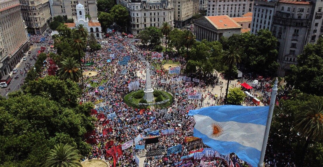 Ahora, 20 años después, un grupo de manifestantes salió a la emblemática Plaza de Mayo de Buenos Aires con consignas muy actuales en contra del FMI.