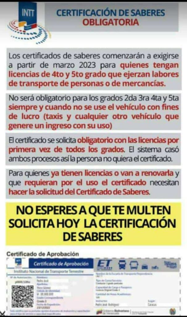 Es obligatorio para las personas que sacan la licencia por primera vez en todos los grados. Además el INTT indica lo siguiente: «El sistema casó ambos procesos así la persona no quiera el certificado». En ese sentido, la institución señaló que aquellas personas que ya tienen licencias o van renovarlas y requieran por el uso el certificado, deben solicitar el documento.