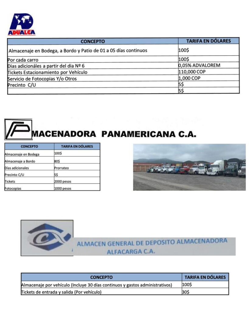 Estas son las tarifas de las almacenadoras habilitadas en San Antonio del Táchira. Tabla de precios cortesía de Clover Venezuela.