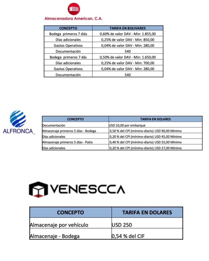 Esta almacenadora tiene sus tarifas expresadas en bolívares y esta es la distribución de precios: